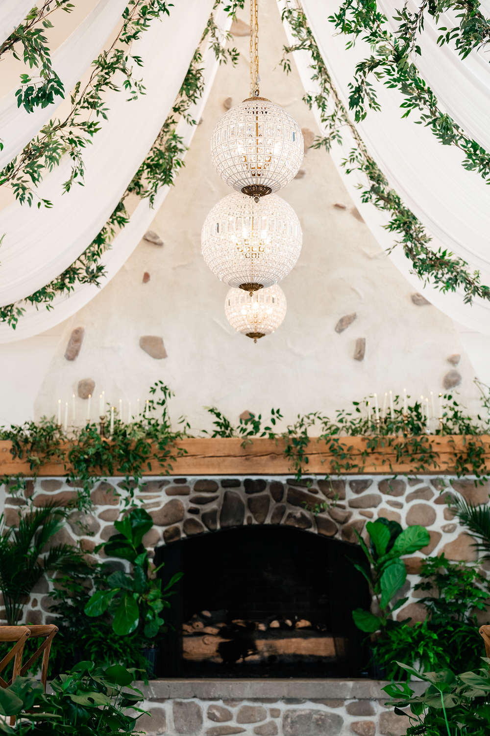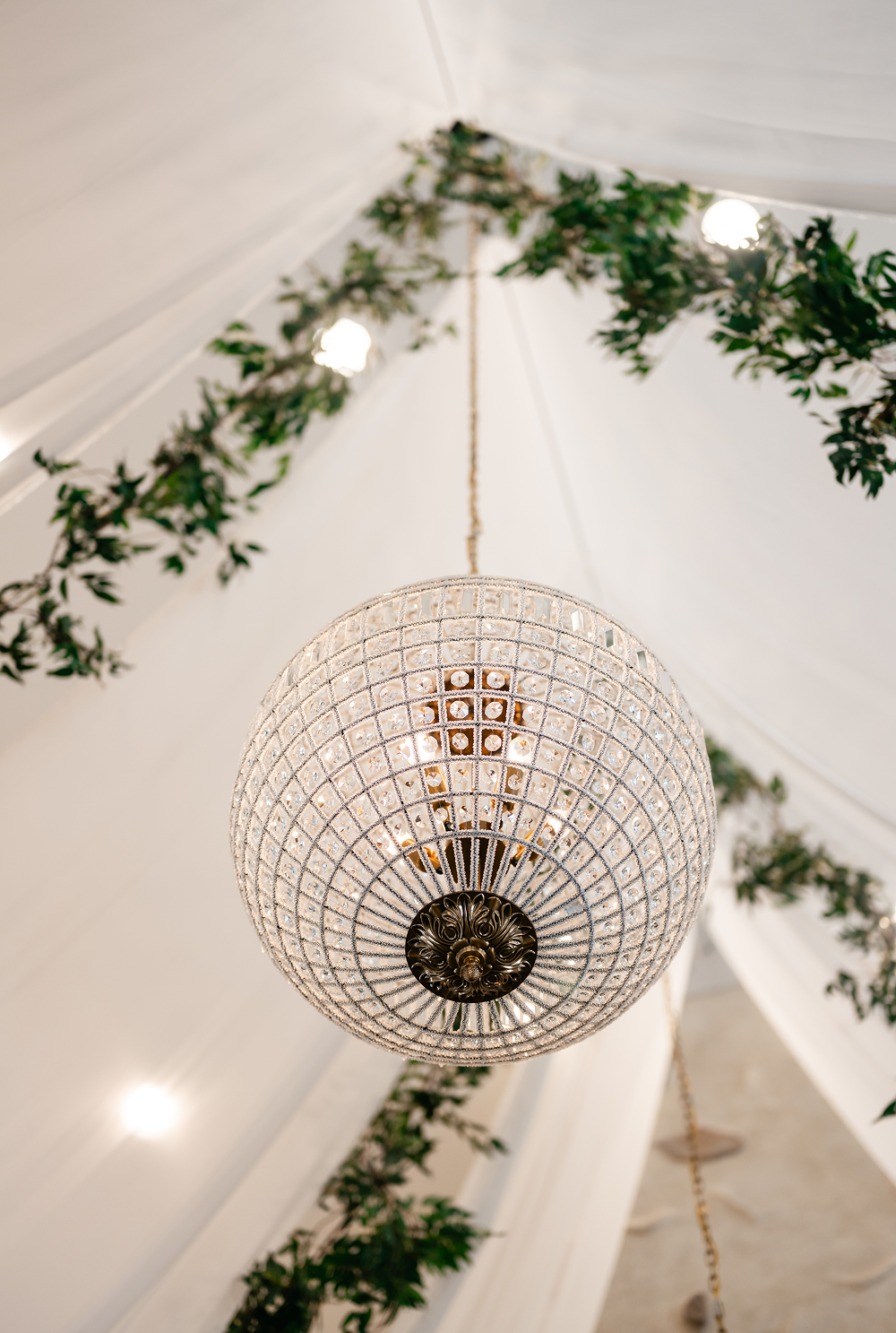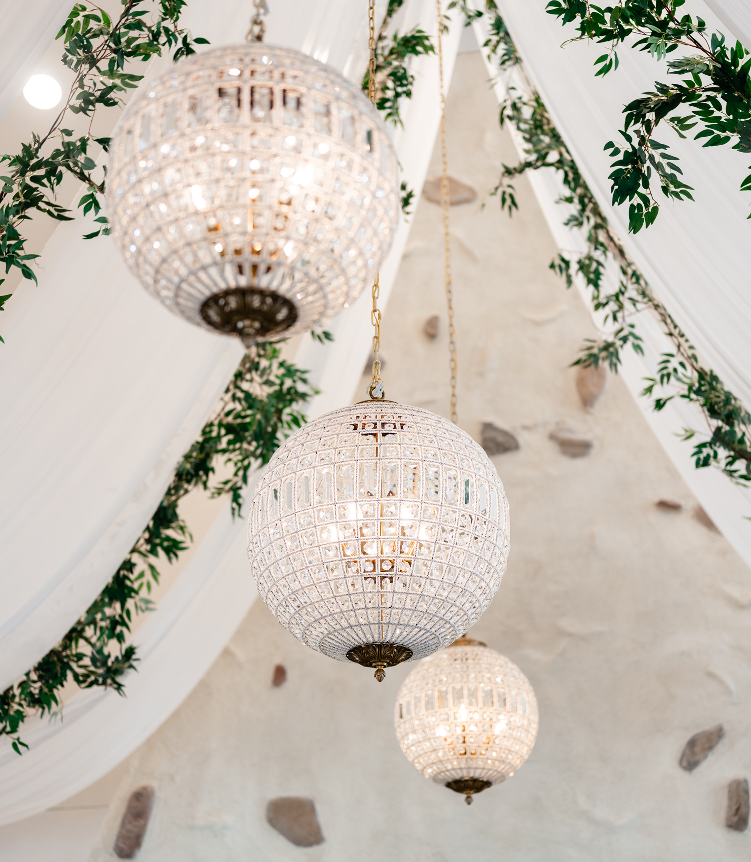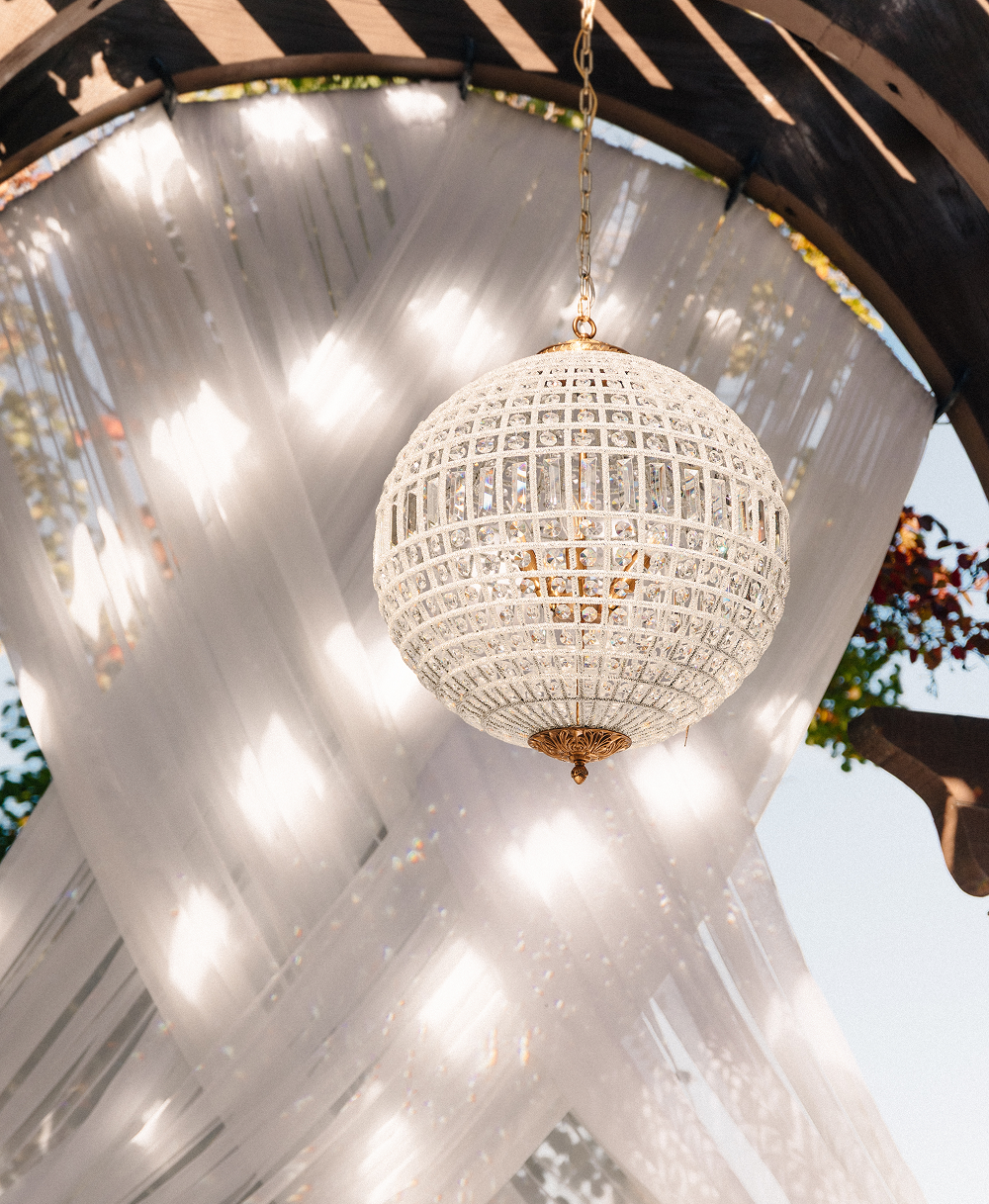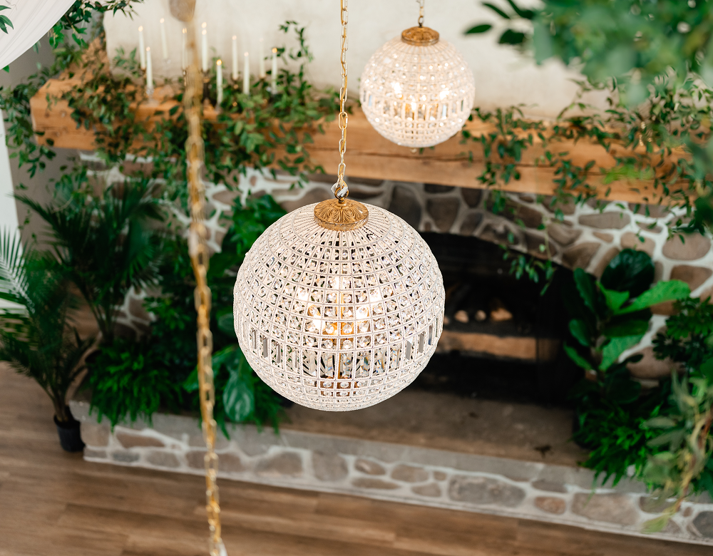 Styling: Crystal globe chandeliers are beautifully styled with cascading greenery for an organic feel or clustered together at varying heights to create a dimensional, statement-making look.