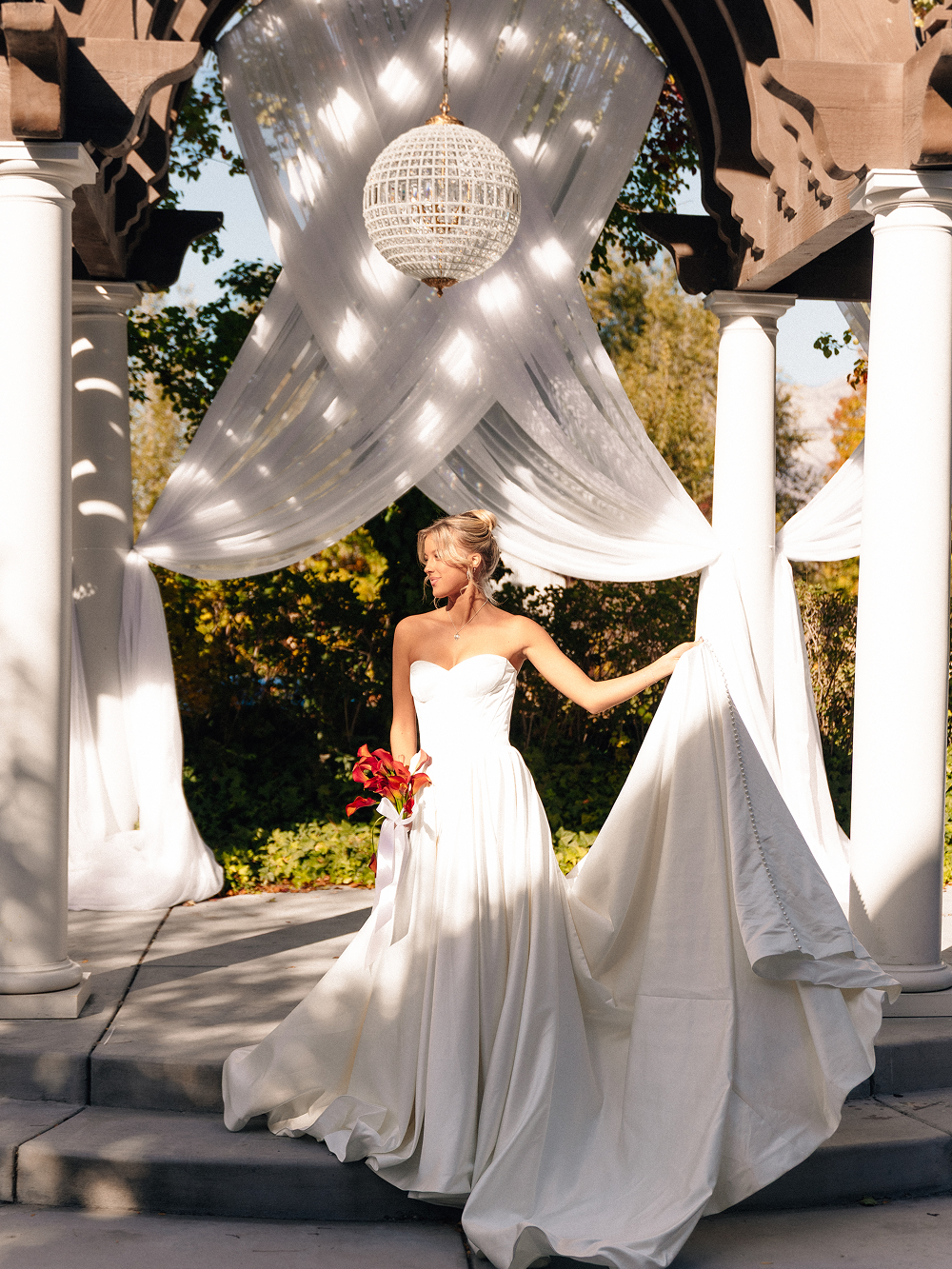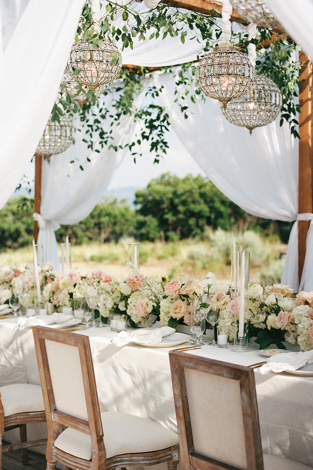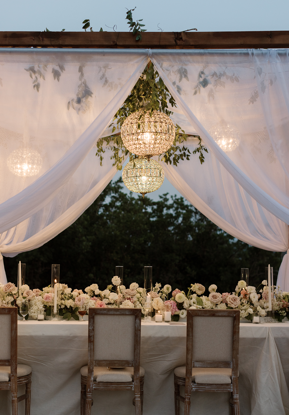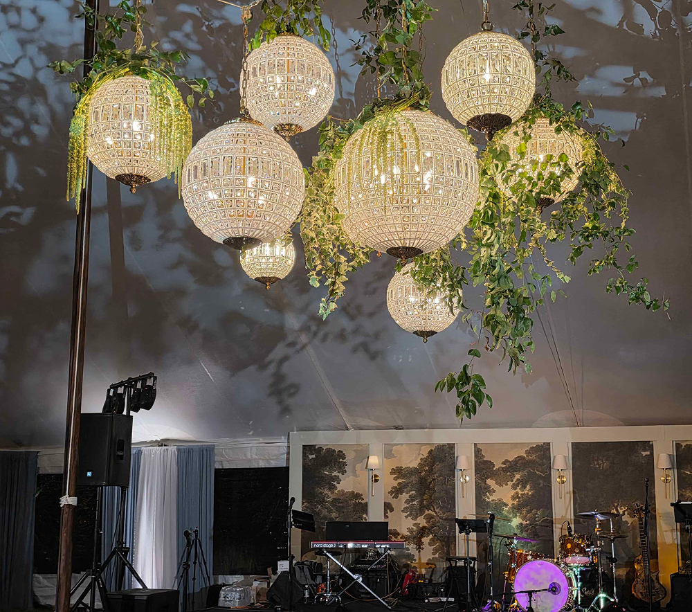 Styling: Crystal globe chandeliers are beautifully styled with cascading greenery for an organic feel or clustered together at varying heights to create a dimensional, statement-making look.
