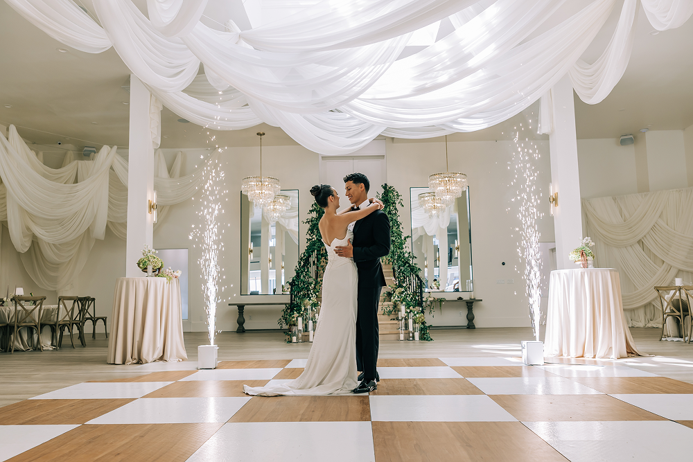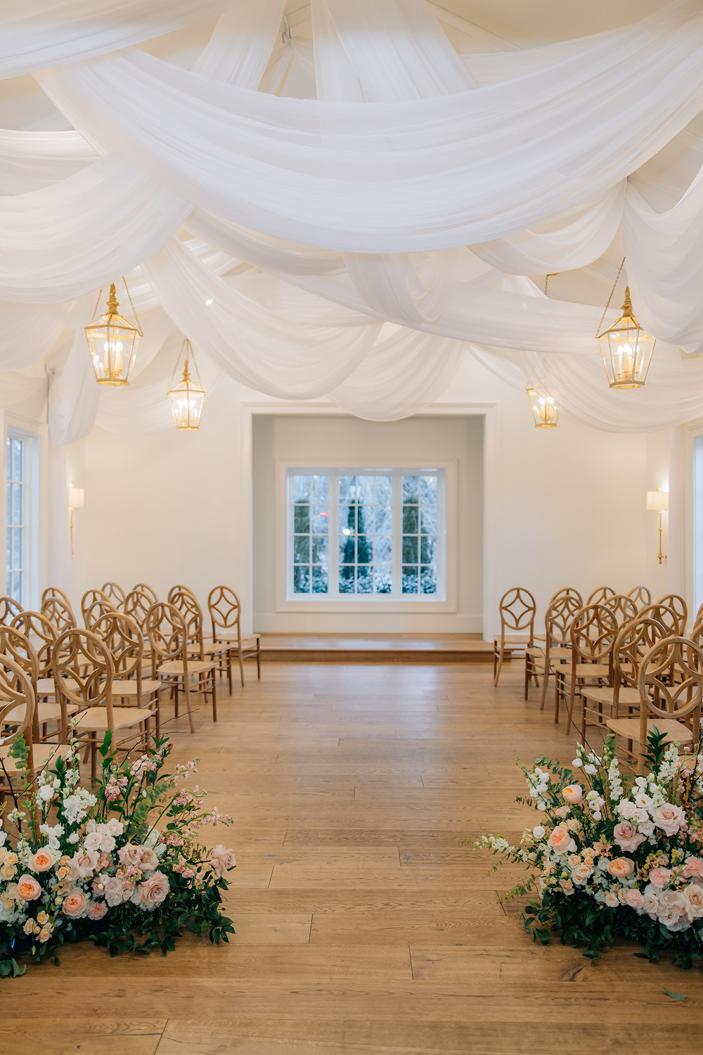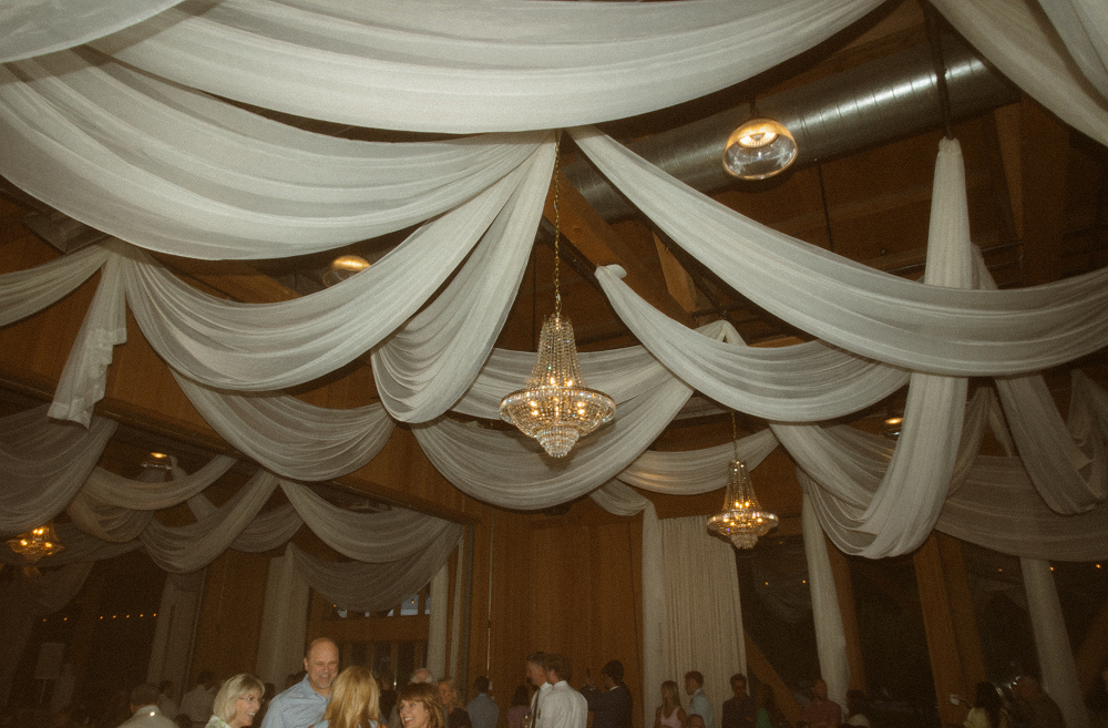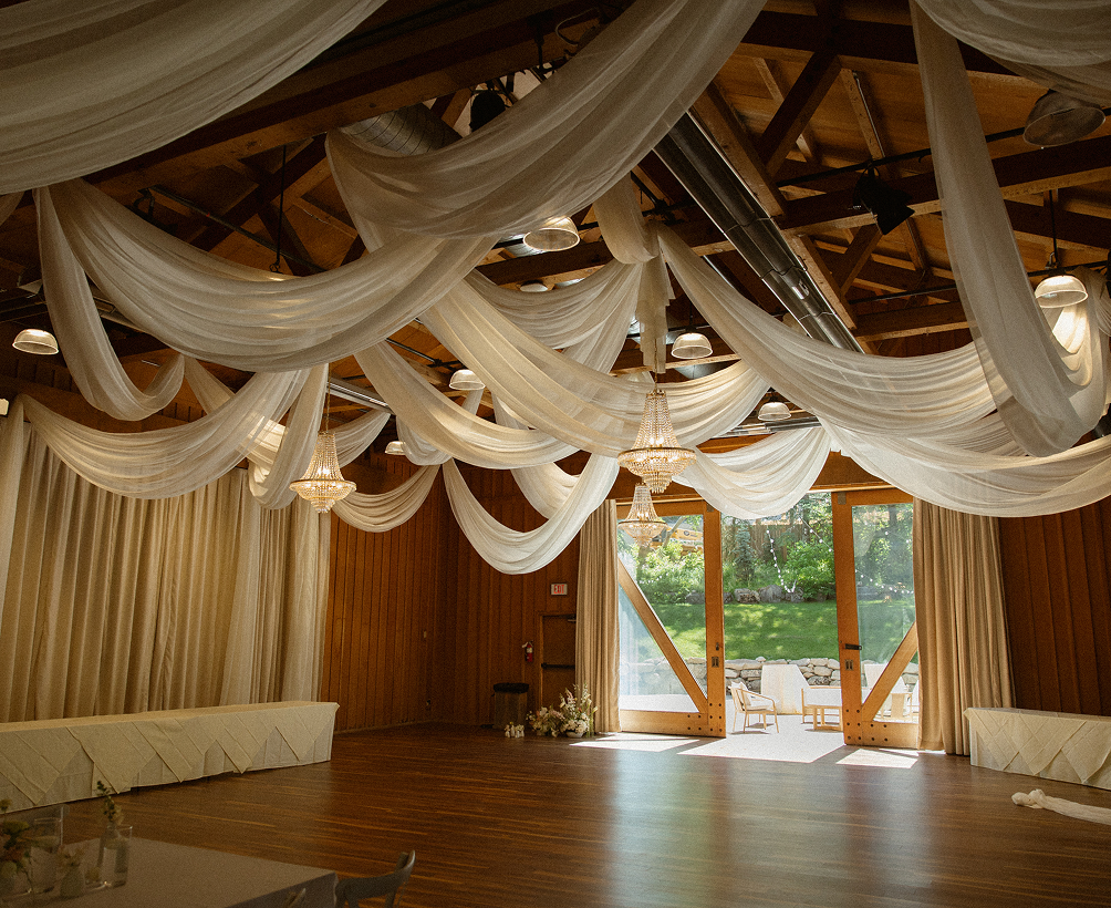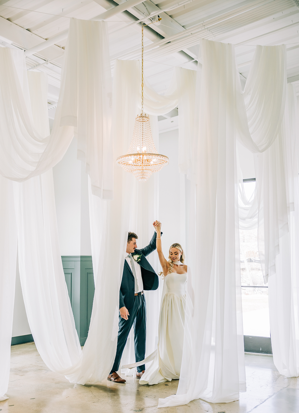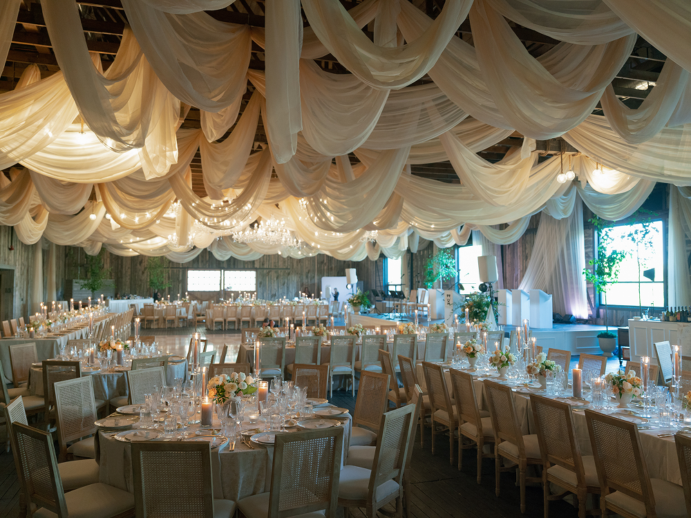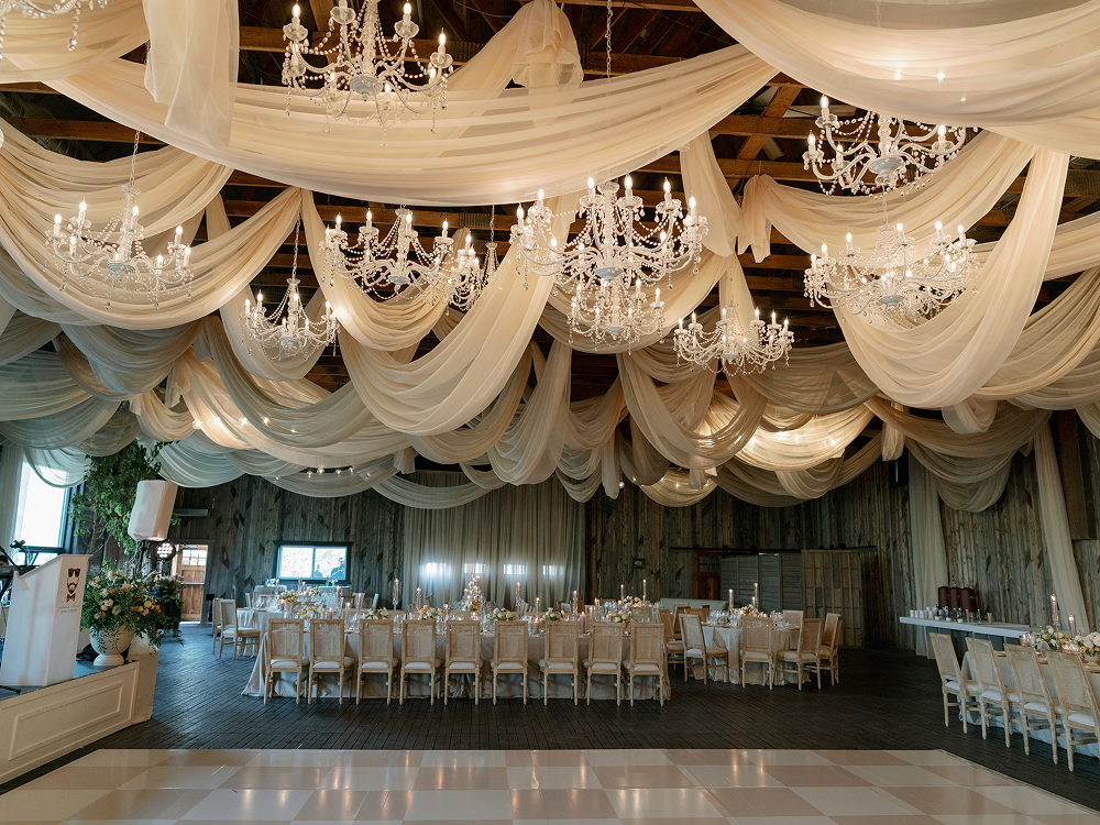 Styling: Abstract draping creates an airy, artistic look that pairs beautifully with French Empire and Crystal Globe chandeliers for a refined, high end finish.