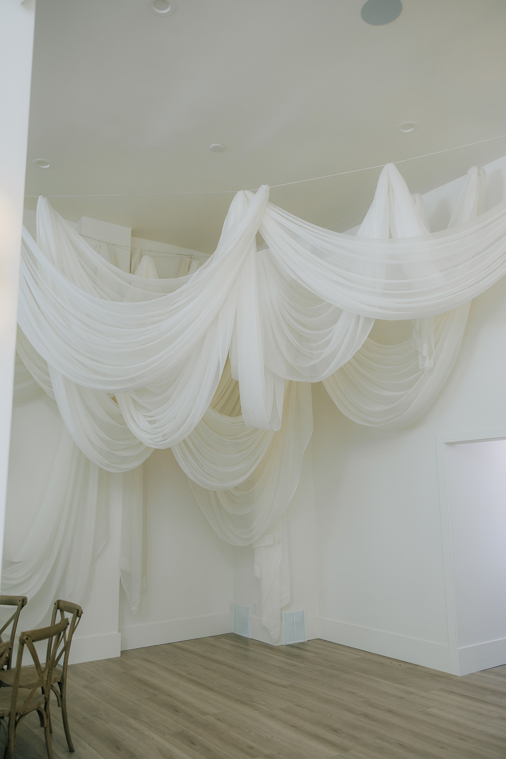 Abstract draping features soft, free flowing fabric arranged in an organic, sculptural way that creates movement and visual interest without a symmetrical pattern. This style adds texture and depth to a space, making it feel intentional, artistic, and effortlessly elevated.