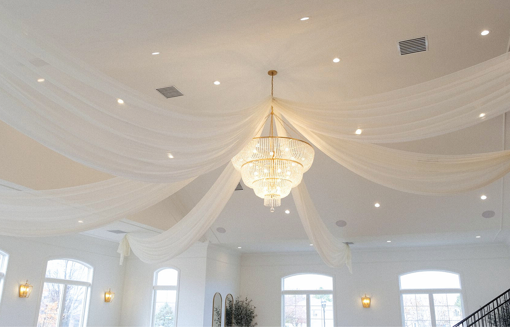 Spoked pinched draping features fabric gathered tightly at a central point and extended outward in clean, radial lines to create structure and visual balance overhead. This style adds height and symmetry while giving the ceiling a polished, intentional design.