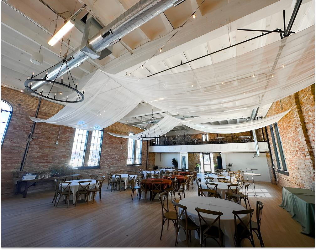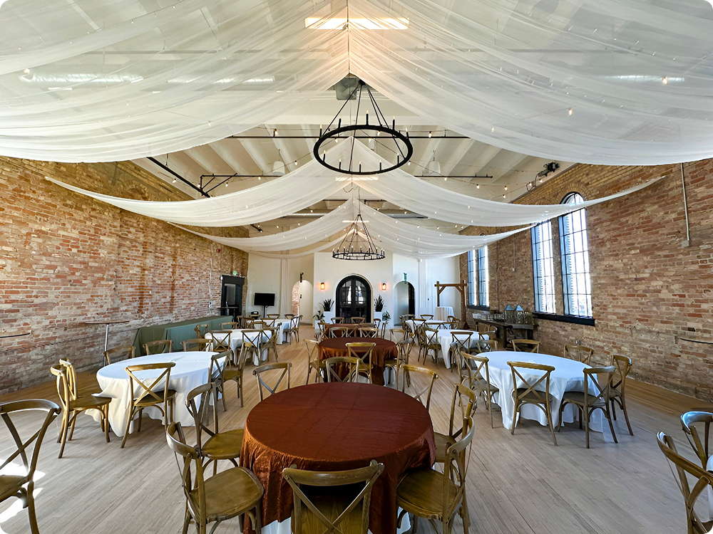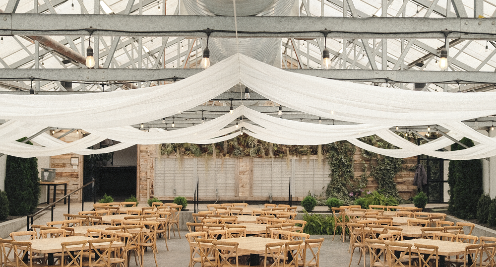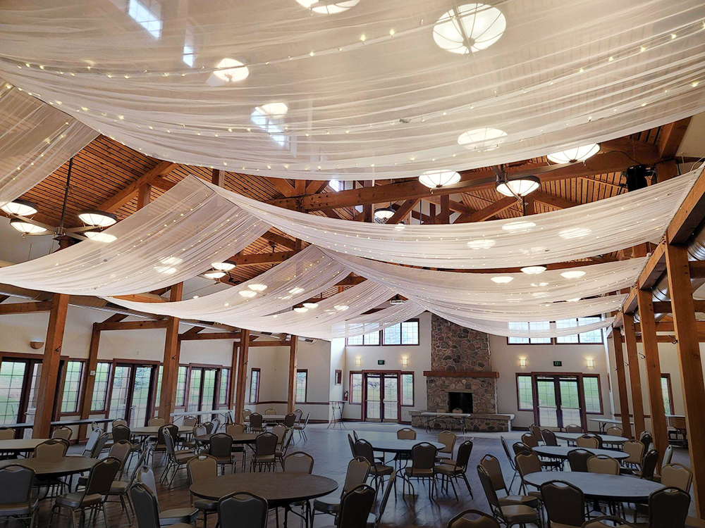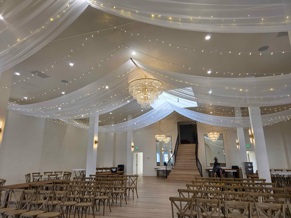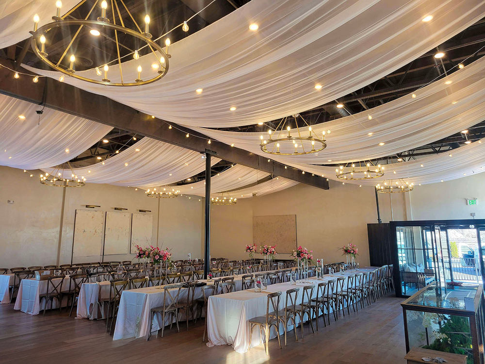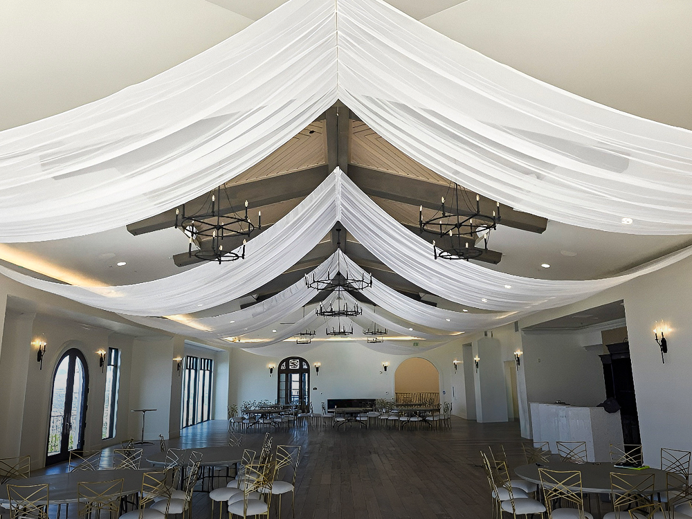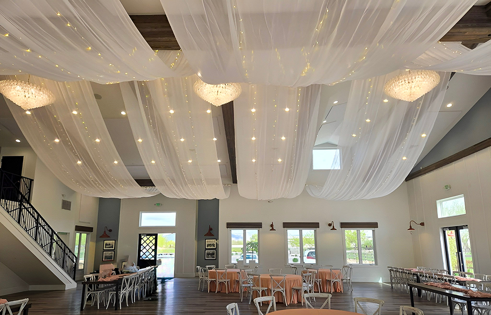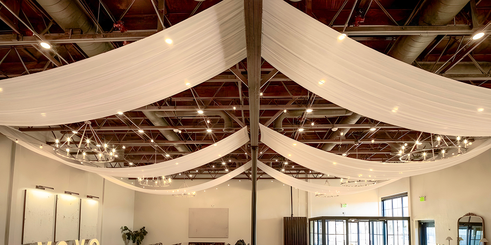 Styling: Spread peaked fabric delivers a romantic, high end ceiling treatment that looks especially stunning with mini lights glowing behind the fabric or bistro lights running between the peaks for added warmth and dimension.