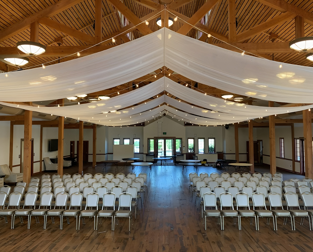 Spread peaked fabric creates soft, sweeping drape panels that rise to elegant peaks, adding height, structure, and movement across the ceiling. This style transforms open spaces into a polished, cohesive design that feels both airy and intentional.