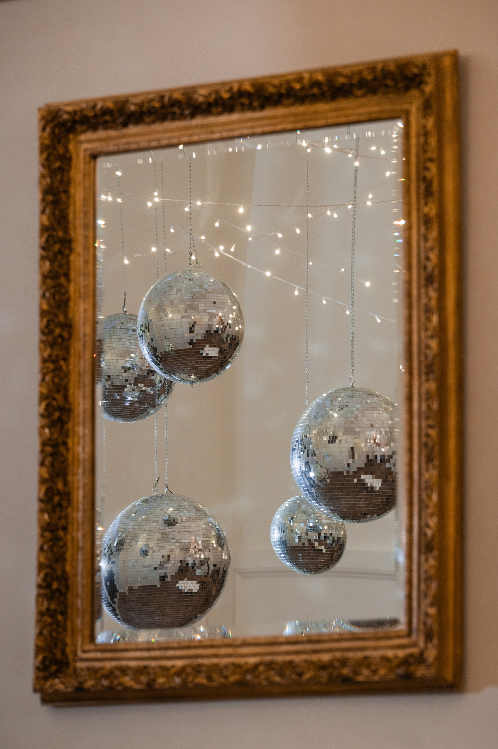 Styling: Disco balls are often styled in clusters or mixed sizes, layered with greenery or soft lighting to create a dynamic, statement-making focal point overhead.