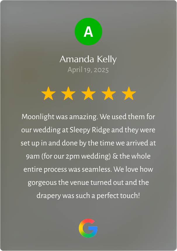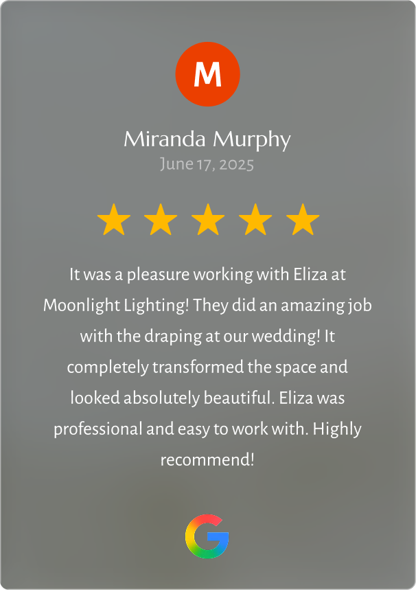 Our personalized service offers flexible packages, professional installation, and thorough cleanup, ensuring a completely hassle-free experience. With years of experience collaborating with planners and venues, we expertly tailor lighting designs to fit any space, creating unforgettable moments for your celebration. But don’t just take our word for it, hear from our customers!