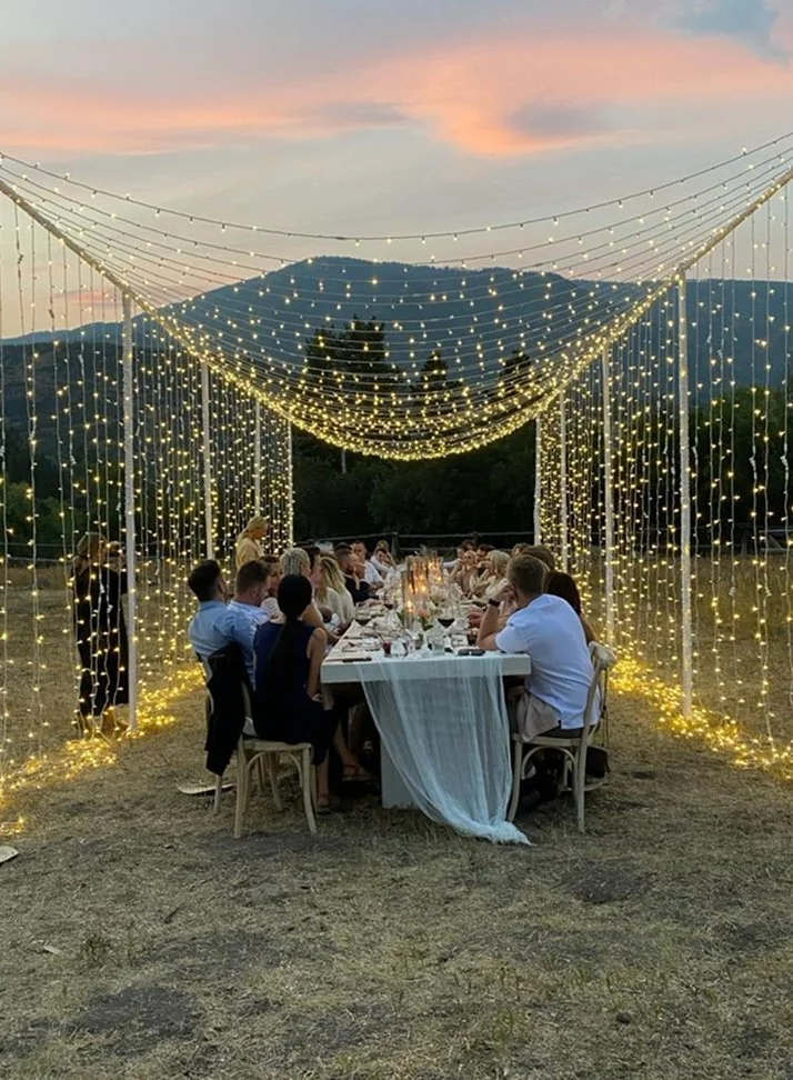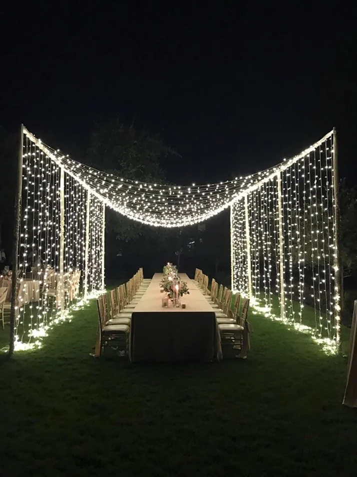 Styling: Hang from beams, ceilings, or tree branches and layer with draping or greenery to create a glowing curtain effect that feels warm, elegant, and inviting.