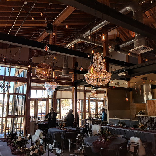 Moonlight Lighting loves working at 4U Ranch, where rustic charm meets wide open views. Thoughtfully placed lighting, from bistro lights outdoors to chandeliers inside the barn, enhances the venue’s natural beauty and creates a warm, welcoming atmosphere for every celebration.