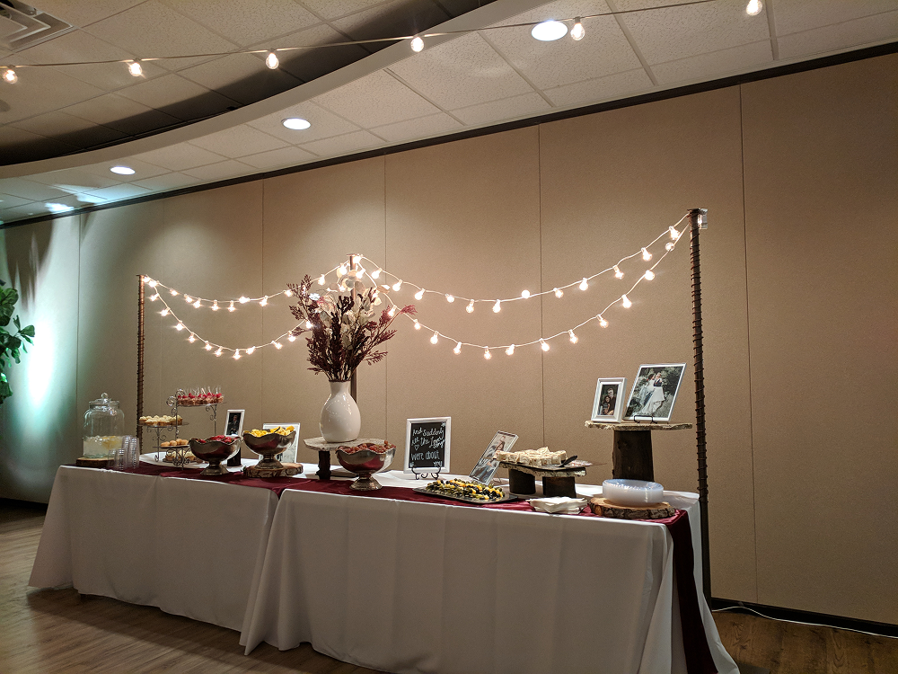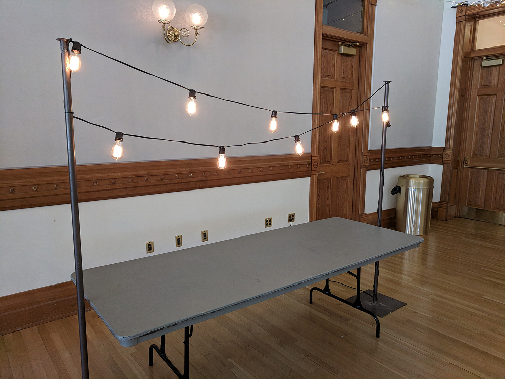 Table lights add a soft, intimate glow at eye level, framing sweetheart tables, dessert displays, and guest book setups with warm bistro lighting. Freestanding poles create height and structure without overhead rigging.